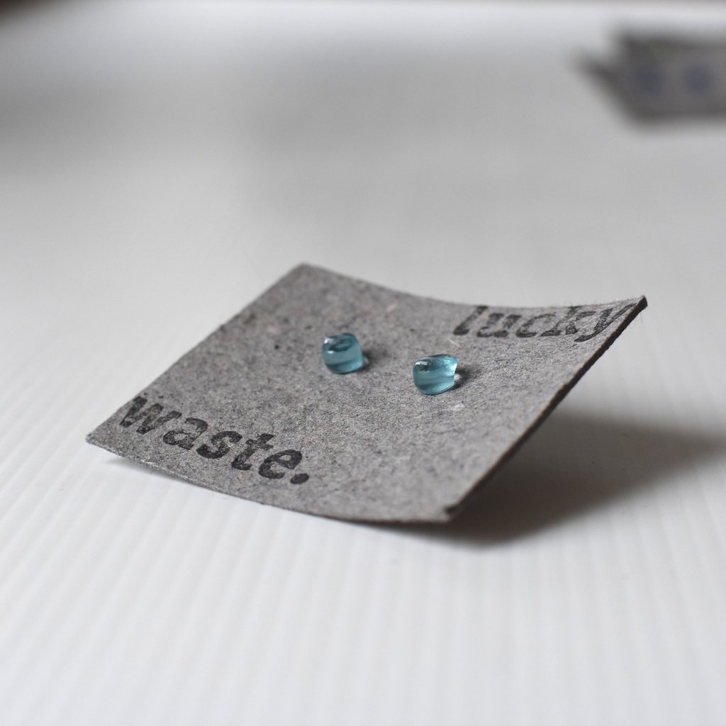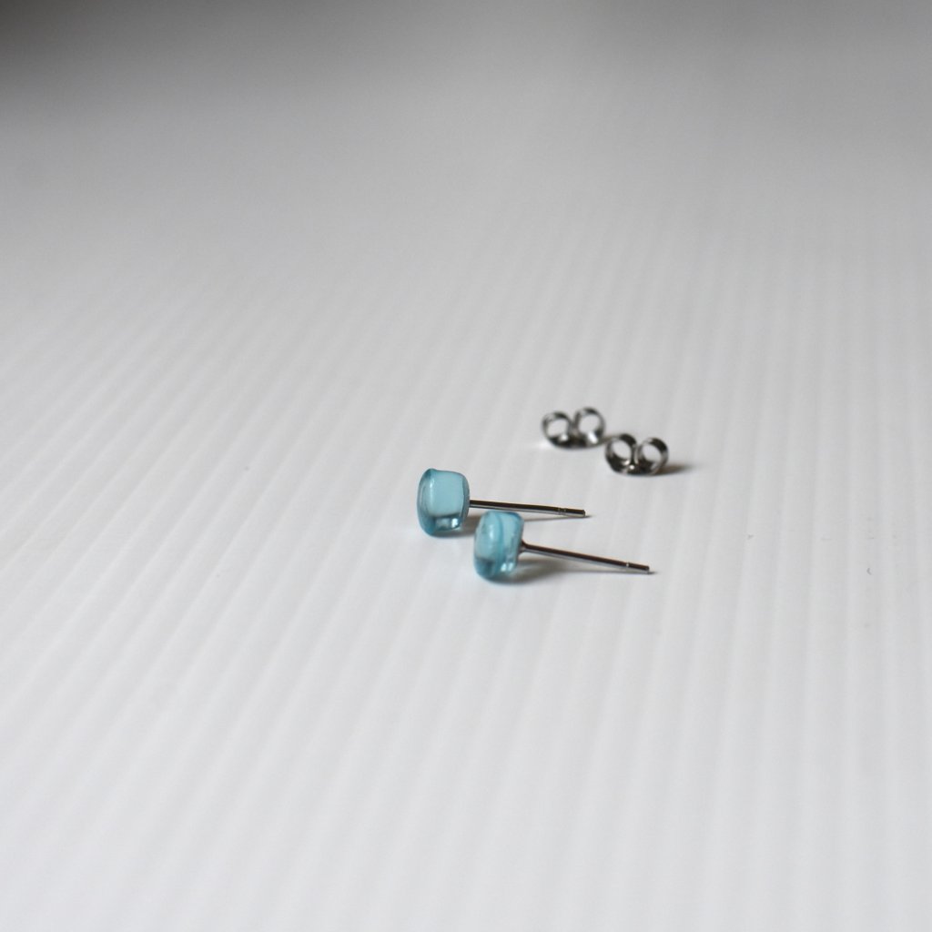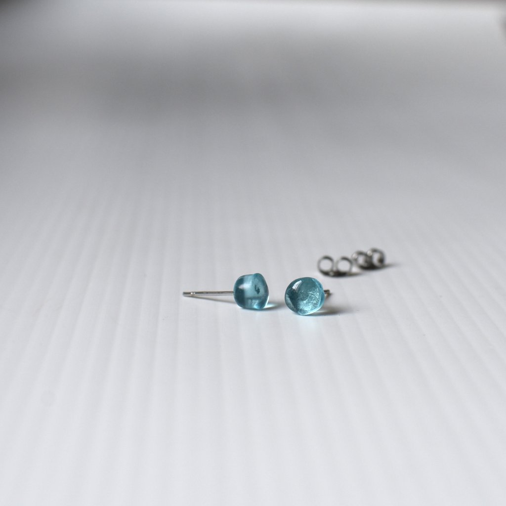 Blankytné drobné pecičky. Proces ručního zpracování láhve a zaoblení (lehání skla) při vysokých teplotách vede k tomu, že je každý kousek svůj. Tento pár náušnic je lehce asymetrický svou velikostí (viz foto).
